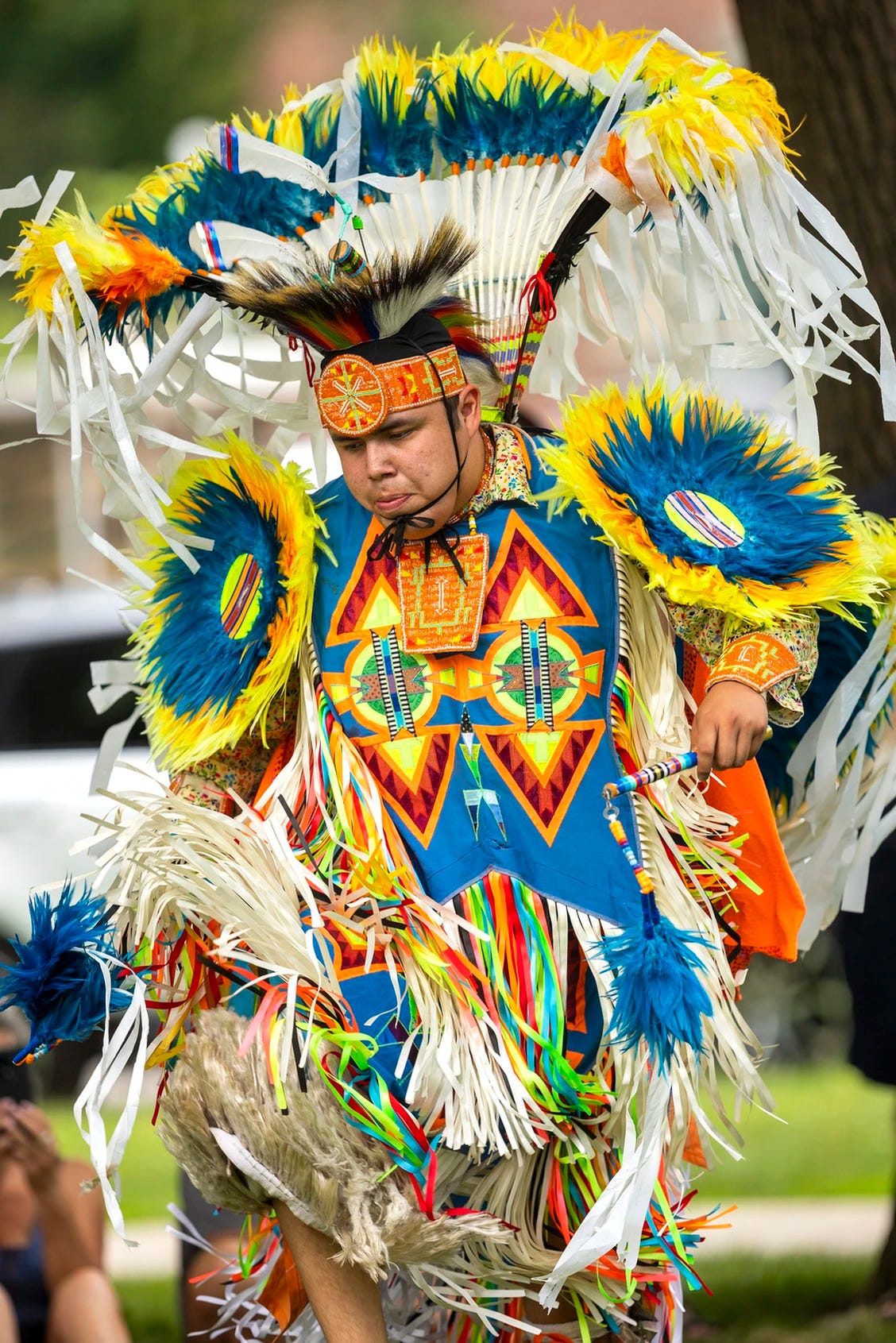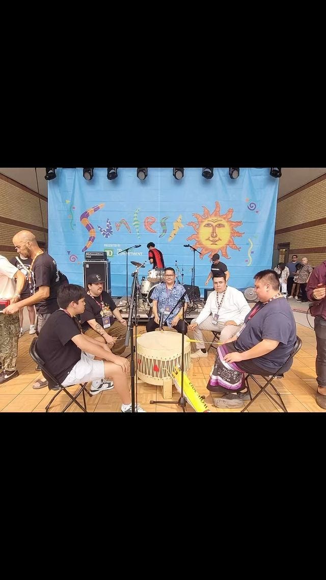 Eagle Flight Singers performed at London’s Annual Sunfest in July of 2024. A performance of five jingle-dress dancers and a traditional exhibition song opened their show. Among them was an 11-year-old dancer named Ivey Sands. This performance was followed by the Lady’s Dance of Respect, which pays tribute to Indigenous women. A highlight of the performance was when 22-year-old Liam Sands (pictured below) wore fancy regalia and danced with whip sticks. The finale encouraged the crows to join the performers in a Cree round dance. This performance was an incredible highlight of local Indigenous musicians and performers.