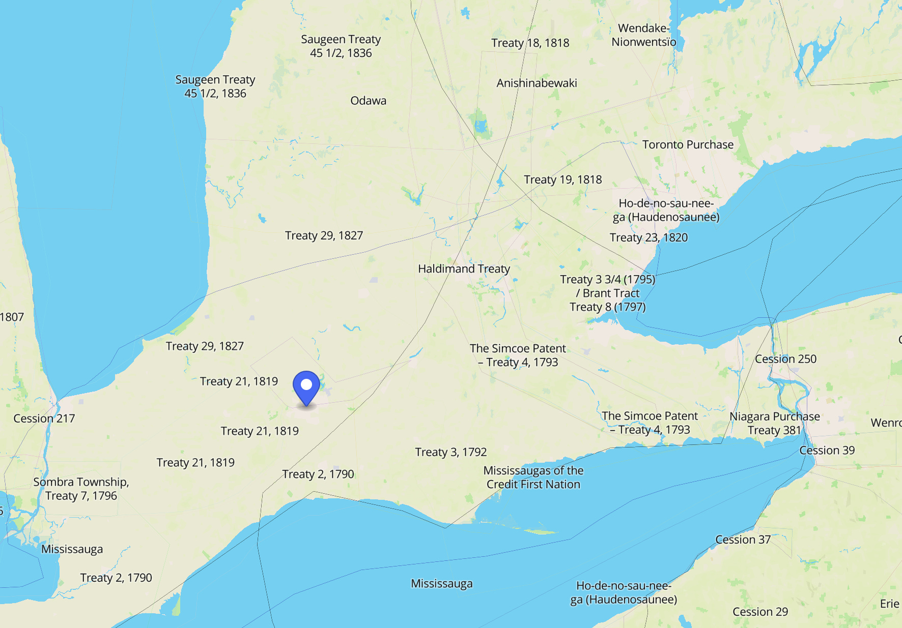We acknowledge all the treaties that are specific to this area: the Two Row Wampum Belt Treaty of the Haudenosaunee Confederacy/Silver Covenant Chain; the Beaver Hunting Grounds of the Haudenosaunee NANFAN Treaty of 1701; the McKee Treaty of 1790, the London Township Treaty of 1796, the Huron Tract Treaty of 1827, with the Anishinaabeg, and the Dish with One Spoon Covenant Wampum of the Anishnaabek and Haudenosaunee.