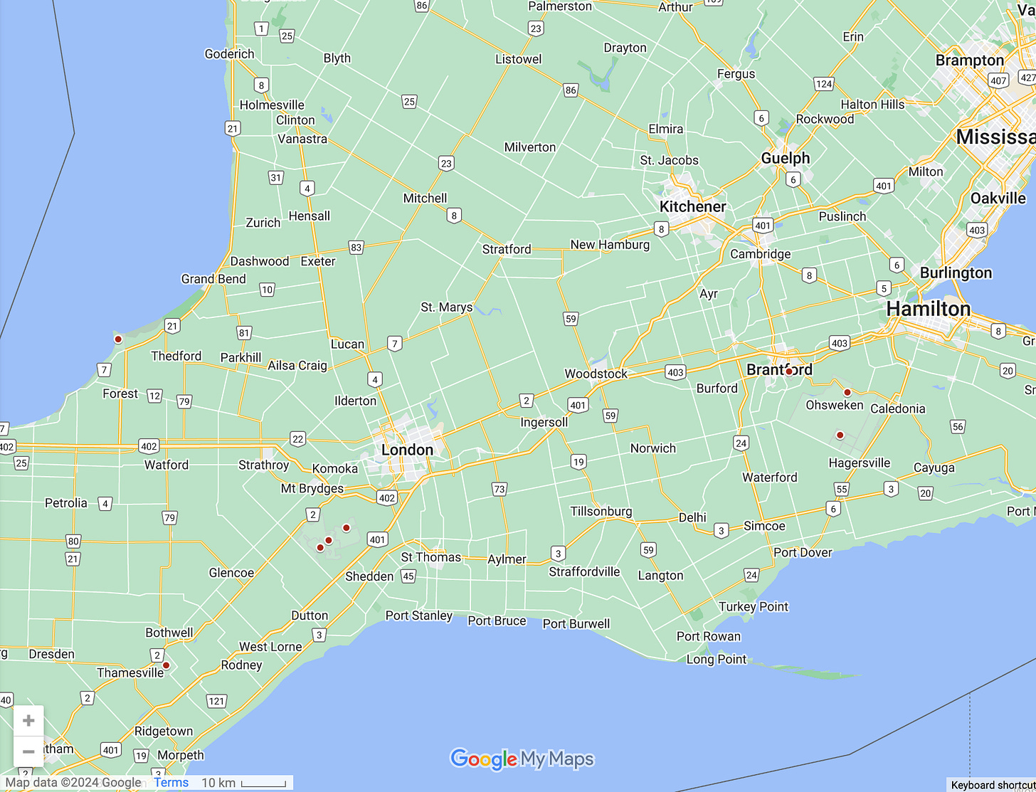 The map below depicts London and the surrounding areas. The red dots are the locations of Indigenous reserves in the area. It must also be noted that urban London is also home to a rich and diverse population of Indigenous folks in urban London, who belong to many nations.