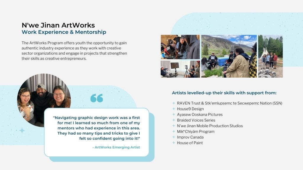 N’we Jinan offers an Artworks Exploring Creative Pathways with Indigenous Youth Program. This is a three year program that is designed to meet young Indigenous artists and creatives where they’re at and support them in developing their skills to get them where they want to go. The program is designed to work with folks between the ages of 15-30 and supports its participants in building skills that will help them with their employability and entrepreneurial skills. Youth who join the program have incredible access to internships, collaborations, workshops, mentorships, and more. They get to be involved in a community of people who have the resources to be able to support them in attaining their goals.
