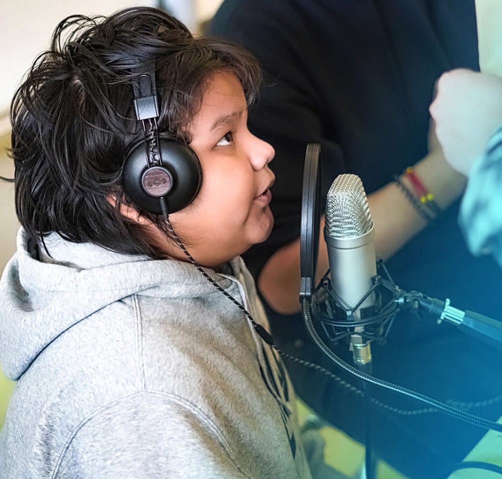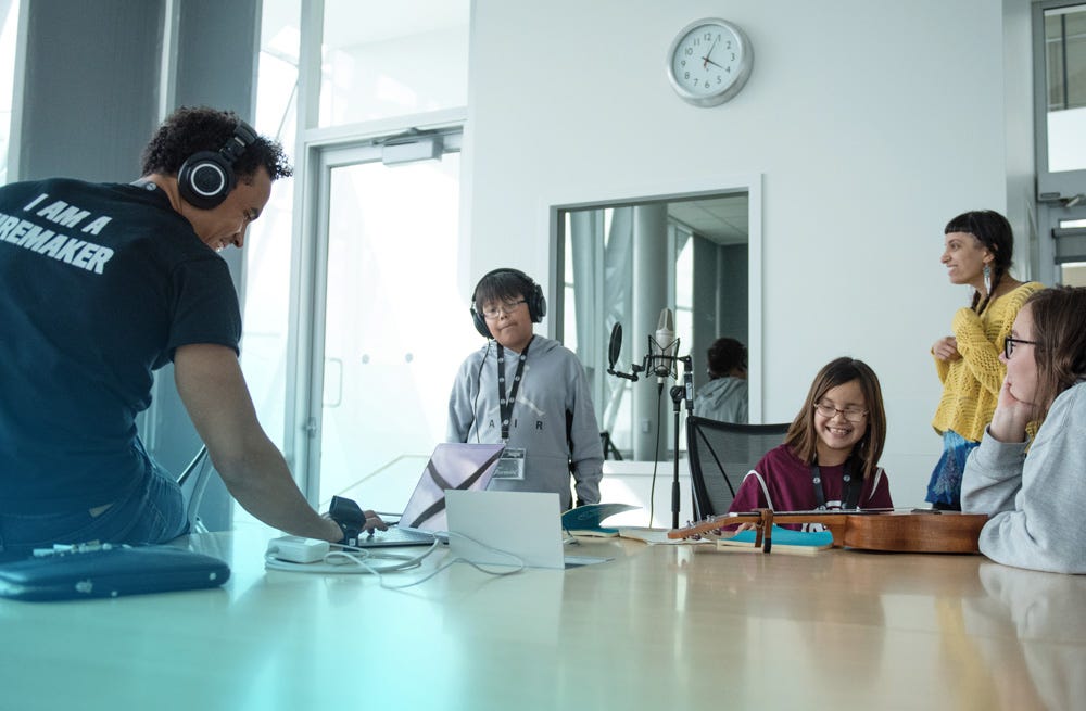 N’we Jinan has created The Mobile Production Studio, which is a 1-week intensive teaching studio for 8-12 students at a time. This program offers students the chance to collaborate with a music producer and a videographer over the course of a week. Students will engage with themes such as language, love, cultural identity, and self-expression. Students will learn arts-based and transferable skills that will help them not only with their success in the arts, but throughout all facets of their lives. Mobile Production Studio is able to visit schools that have the required criteria.